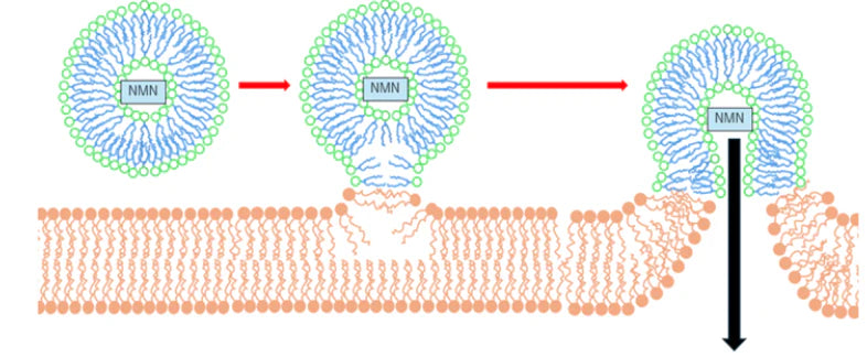 NMN is encapsulated in a fat-based liposome, which merges with the cell membrane to deliver NMN directly inside. This process enhances absorption, protects NMN from degradation, and improves its effectiveness compared to standard NMN supplements.
