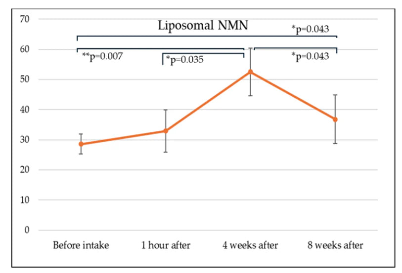 This figure illustrates that supplementation with Liposomal NMN significantly increased NAD+ levels after four weeks, compared to both pre-supplementation and one hour post-intake. After stopping supplementation, NAD+ levels were decreased at 8 weeks, though they remained higher than baseline.
