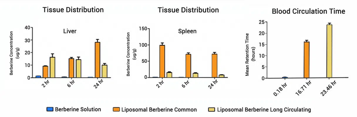 The figure below shows the amount of liposomal Berberine formulations (yellow and orange bars) is higher in tissues and blood compared to a standard formulation (blue bar).