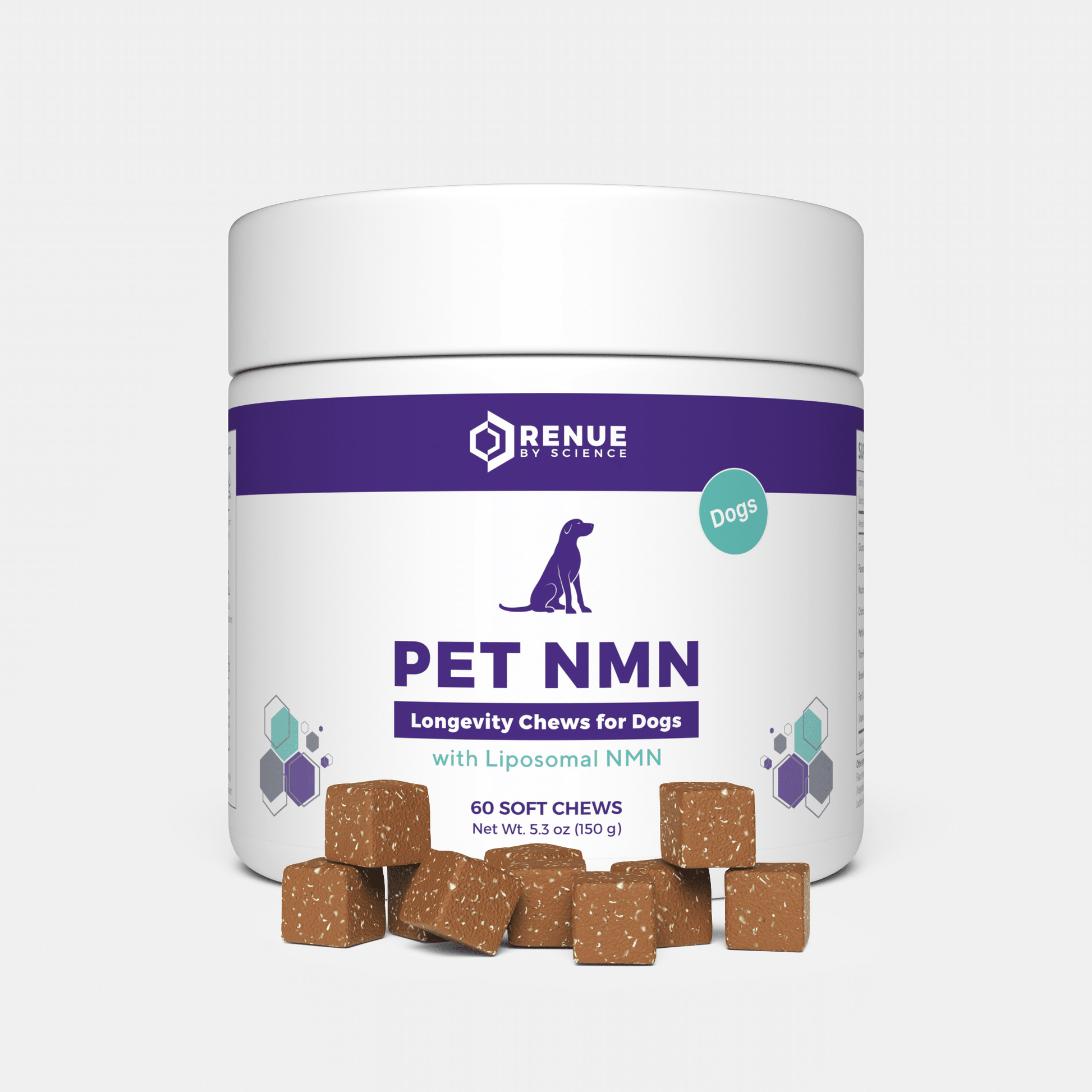 PET NMN Longevity Chews for Dogs provide a blend of liposomal NMN, Trans-Resveratrol, Boswellia Serrata, Organic Flaxseed Powder, Chondroitin, MSM and Glucosamine. Best of all, pets love the delicious taste.
