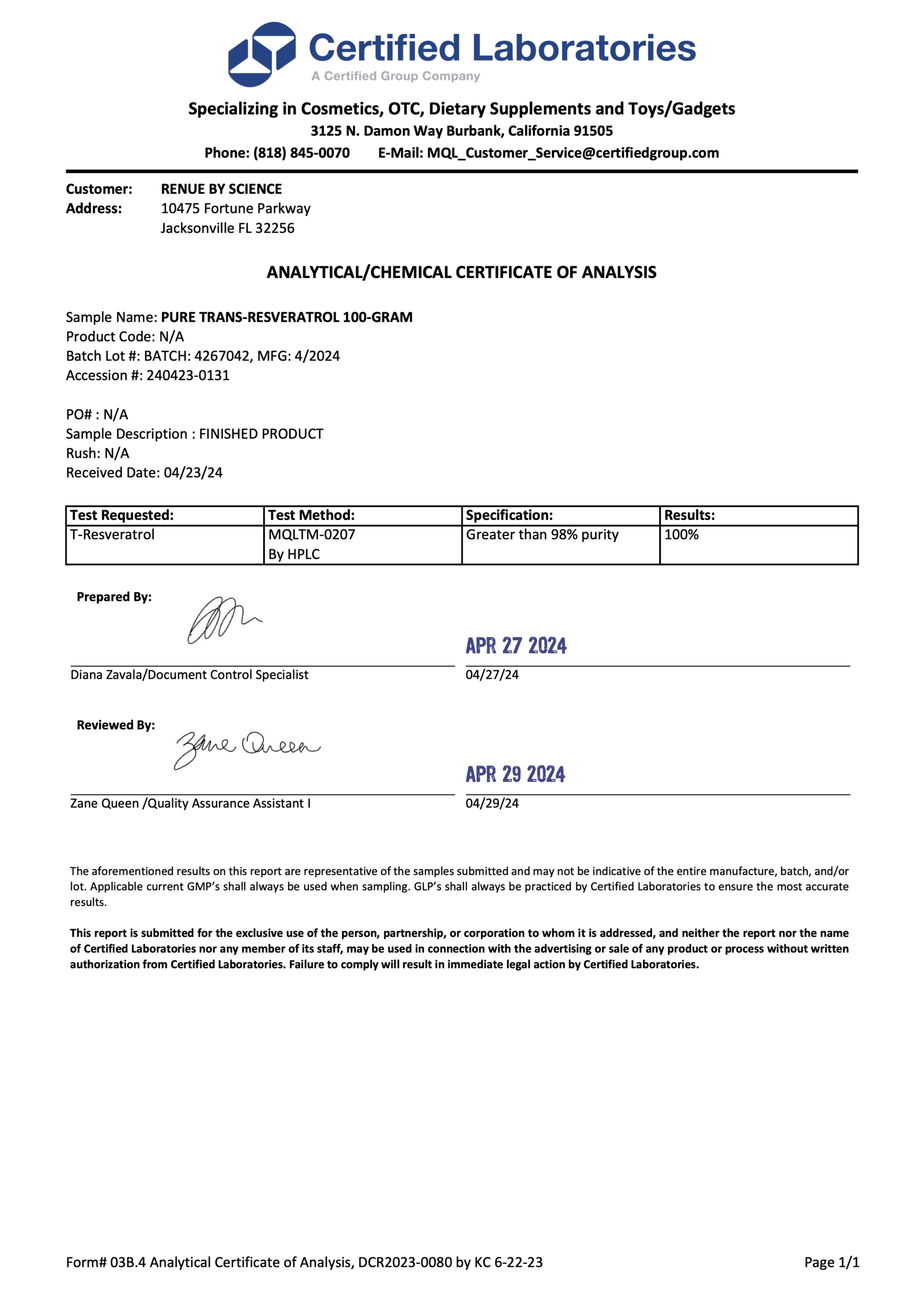 Strength and Purity Certification
