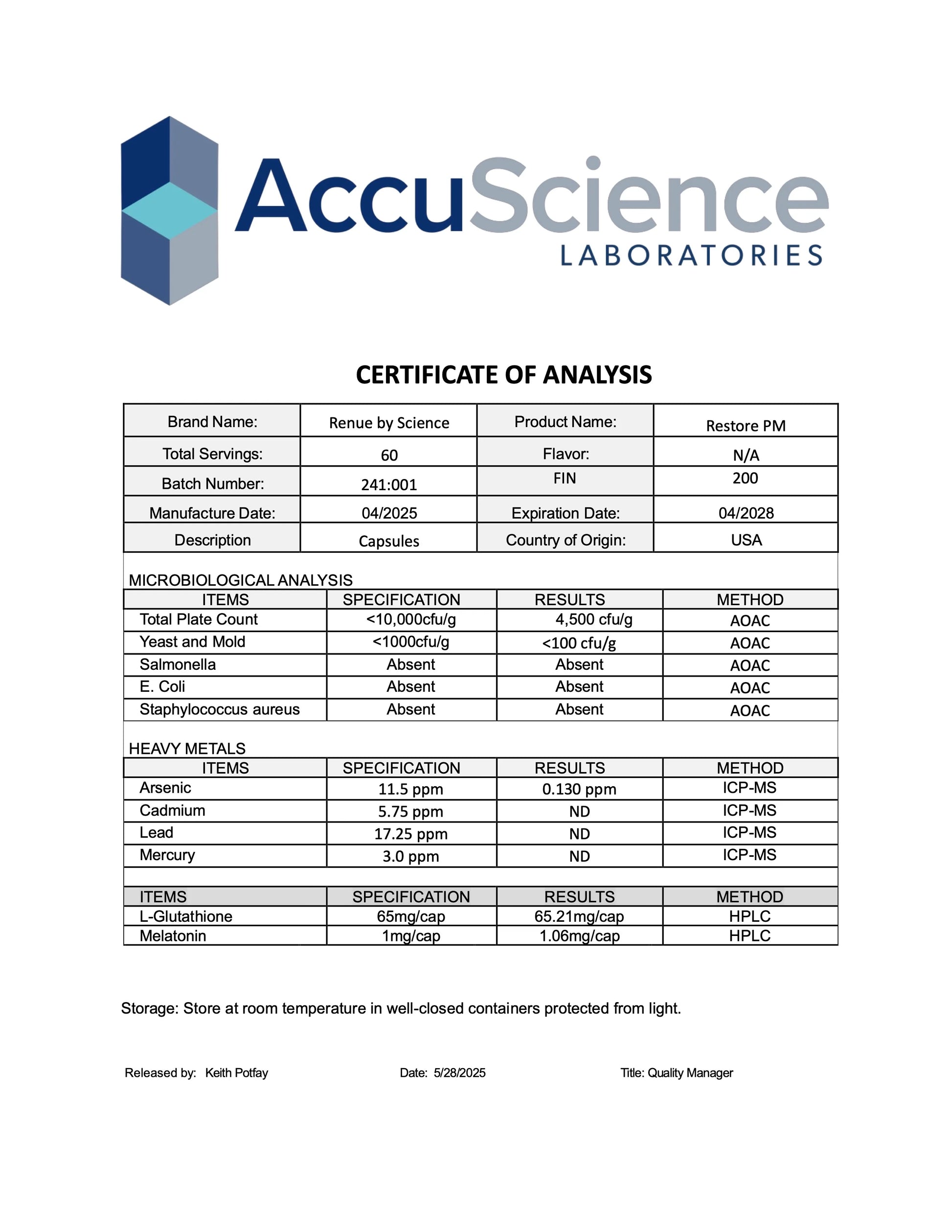 Restore PM - Certificate of Analysis