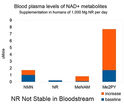 “Oral NR dosing increased circulating NAM ~40-fold while NMN remained unchanged and NR was detected only at trace levels in the blood.”