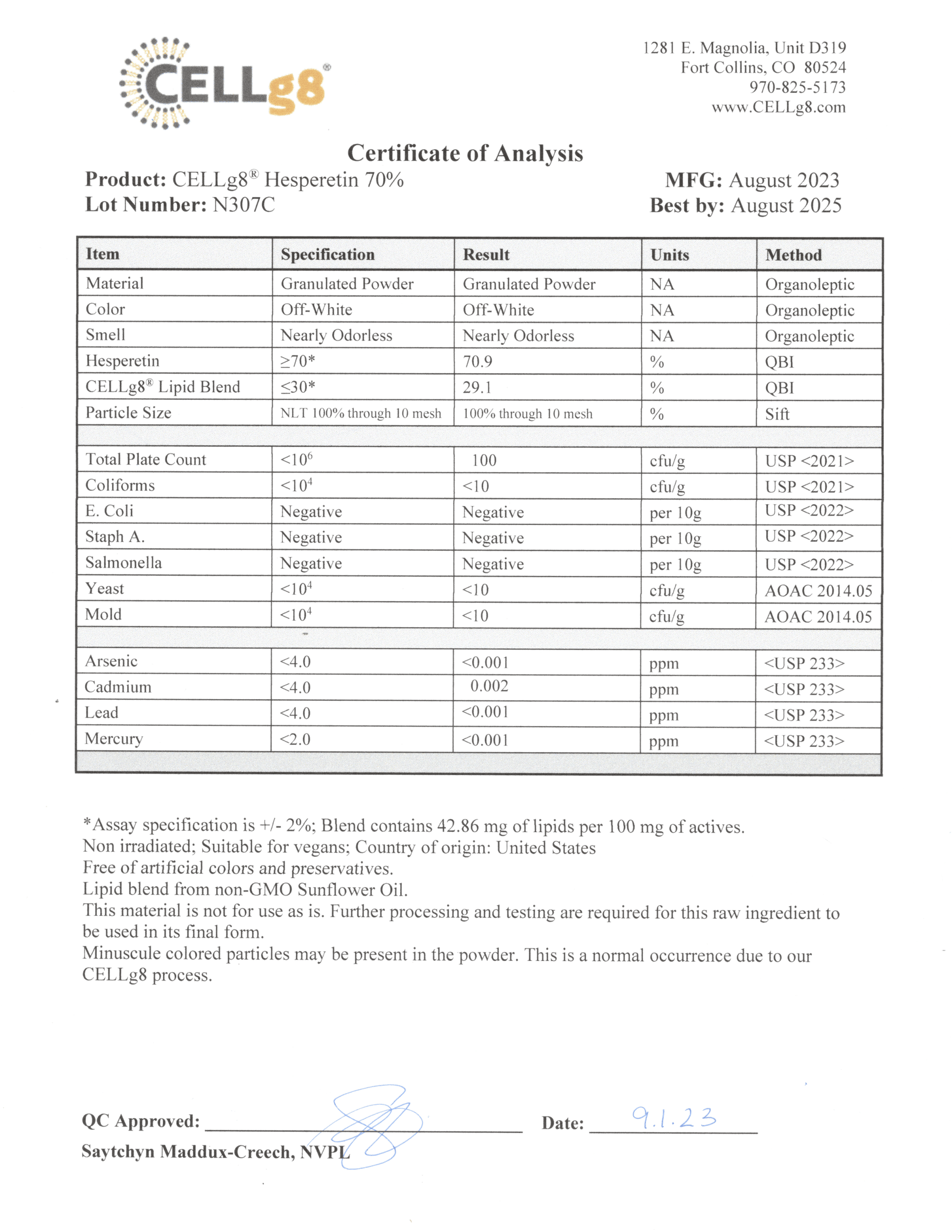 An evaluation of 18 clinical trials in a meta-analysis revealed Hesperidin reduced several markers of inflammation and the levels of MDA, a marker of damage to fat important for cell function and structure.†