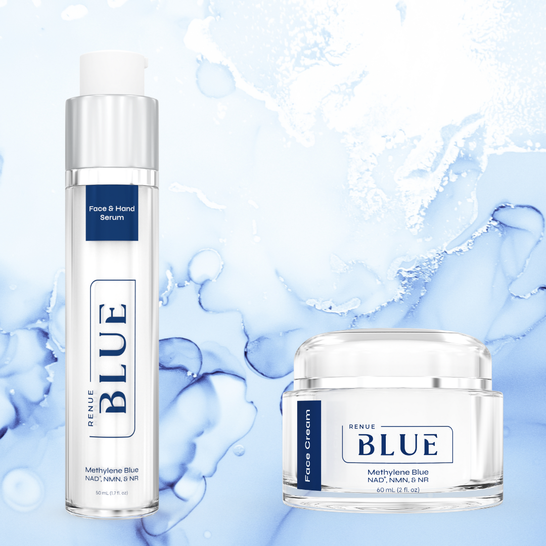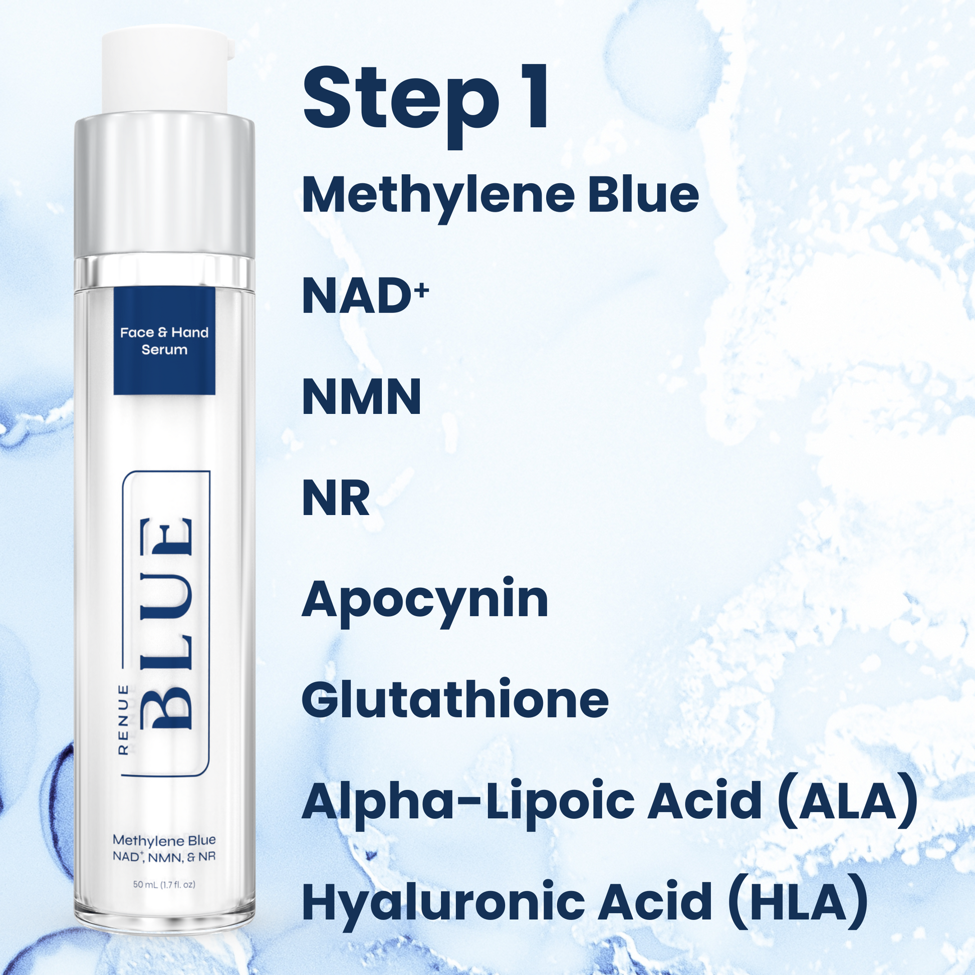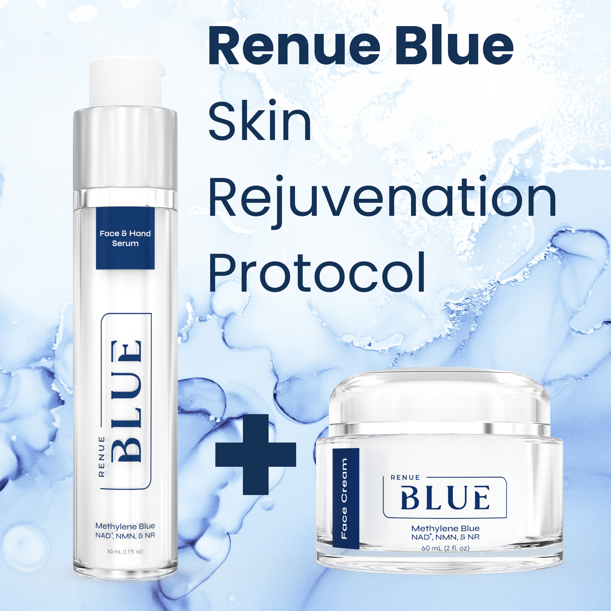 The Renue Blue Skin Rejuvenation Protocol is formulated around the NAD+ Complex and Methylene Blue, supported by other scientifically proven nutrients to improve skin’s smoothness, elasticity, and strength.